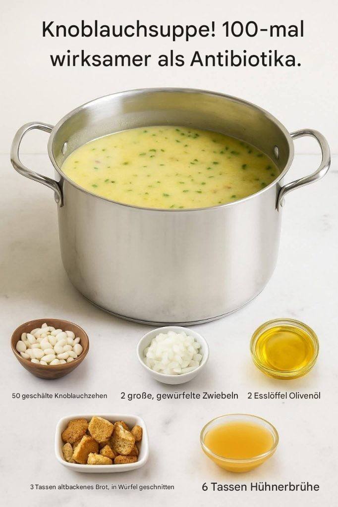 Knoblauch gilt seit Jahrtausenden als eines der wirkungsvollsten natürlichen Heilmittel der Welt – und seine Kraft entfaltet sich in dieser Knoblauchsuppe auf besonders wohltuende Weise. Schon in der Antike wurde Knoblauch nicht nur als Gewürz, sondern auch als Medizin geschätzt. Seine Inhaltsstoffe, vor allem Allicin, wirken antibakteriell, antiviral und stärken das Immunsystem auf natürliche Weise. Diese traditionelle Suppe vereint all diese Eigenschaften in einer warmen, cremigen und aromatischen Form, die Körper und Geist gleichermaßen guttut.
